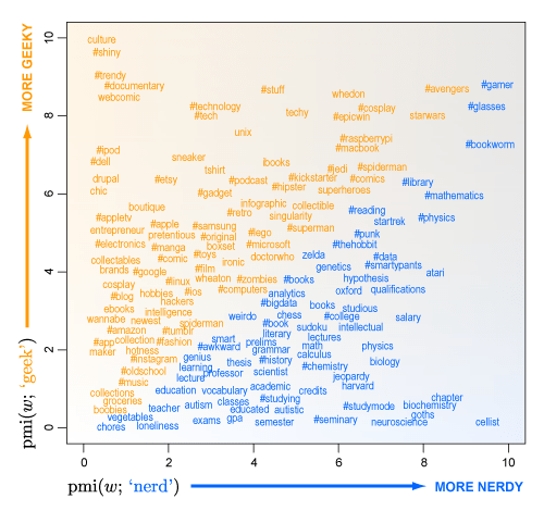 Moving up the vertical axis, words become more geeky (“#music” → “#gadget” → “#cosplay”), and moving left to right they become more nerdy (“education” → “grammar” → “neuroscience”). Words along the diagonal are similarly geeky and nerdy, including social (“#awkward”, “weirdo”), mainstream tech (“#computers”, “#microsoft”), and sci-fi/fantasy terms (“doctorwho,” “#thehobbit”). Words in the lower-left (“chores,” “vegetables,” “boobies”) aren’t really associated with either, while those in the upper-right (“#avengers”, “#gamer”, “#glasses”) are strongly tied to both. Orange words are more geeky than nerdy, and blue words are the opposite. Some observations: