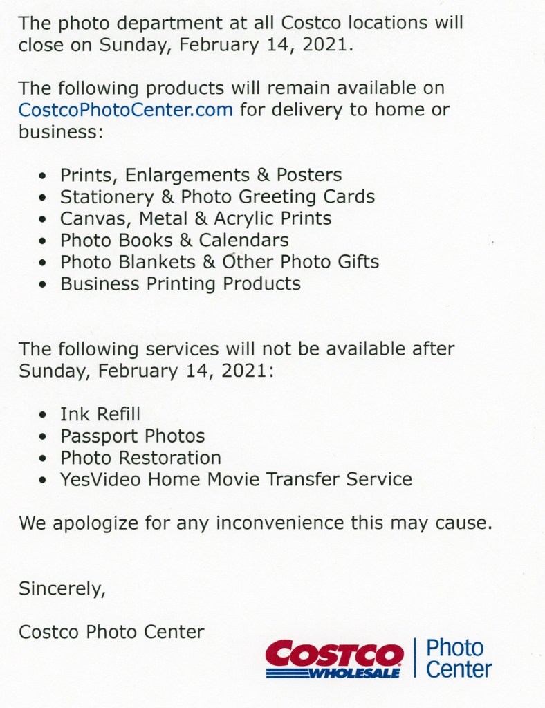 The inevitable happened on Monday, January 11, 2021. We were held to the utmost secrecy but the truth was told to us: All in-warehouse photo centers to be closed on February 14, 2021 – Valentine’s Day.