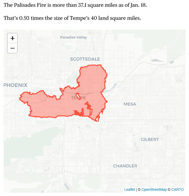The remaining 2 fires: Palisades, Eaton – are not contained because of their immense size! Eaton is 65% contained (updated January 18, 2025, @ 4:02 a.m.) Palisades is 35% contained. Just how big is the [Pacific] Palisades Fire, you ask?